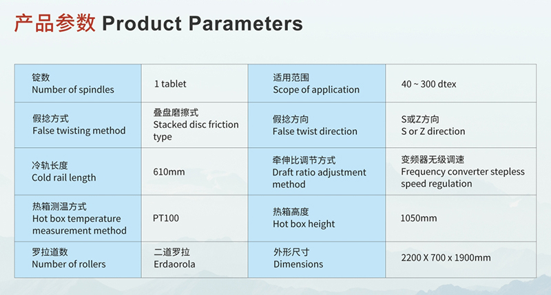 DTY加彈實驗機的產品特點:該設備將滌綸(POY)、丙綸等無捻原絲,通過假捻變形加工成為具有中彈、低彈性能的彈力絲,同時可增加網絡部件進行網絡絲的加工。